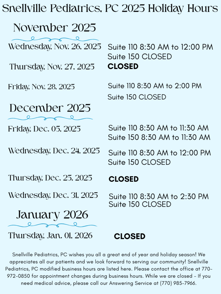 Snellville Pediatrics P.C. will close Monday, December 26th, 2022 in observance of Christmas Holiday. If you need medical advice, please call our Answering Service at (770) 985-7966.