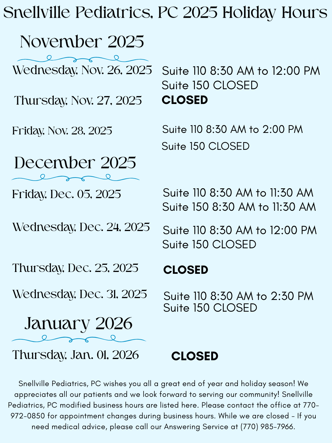 Snellville Pediatrics P.C. will close Monday, January 2nd, 2023 in observance of New Years Holiday. If you need medical advice, please call our Answering Service at (770) 985-7966.