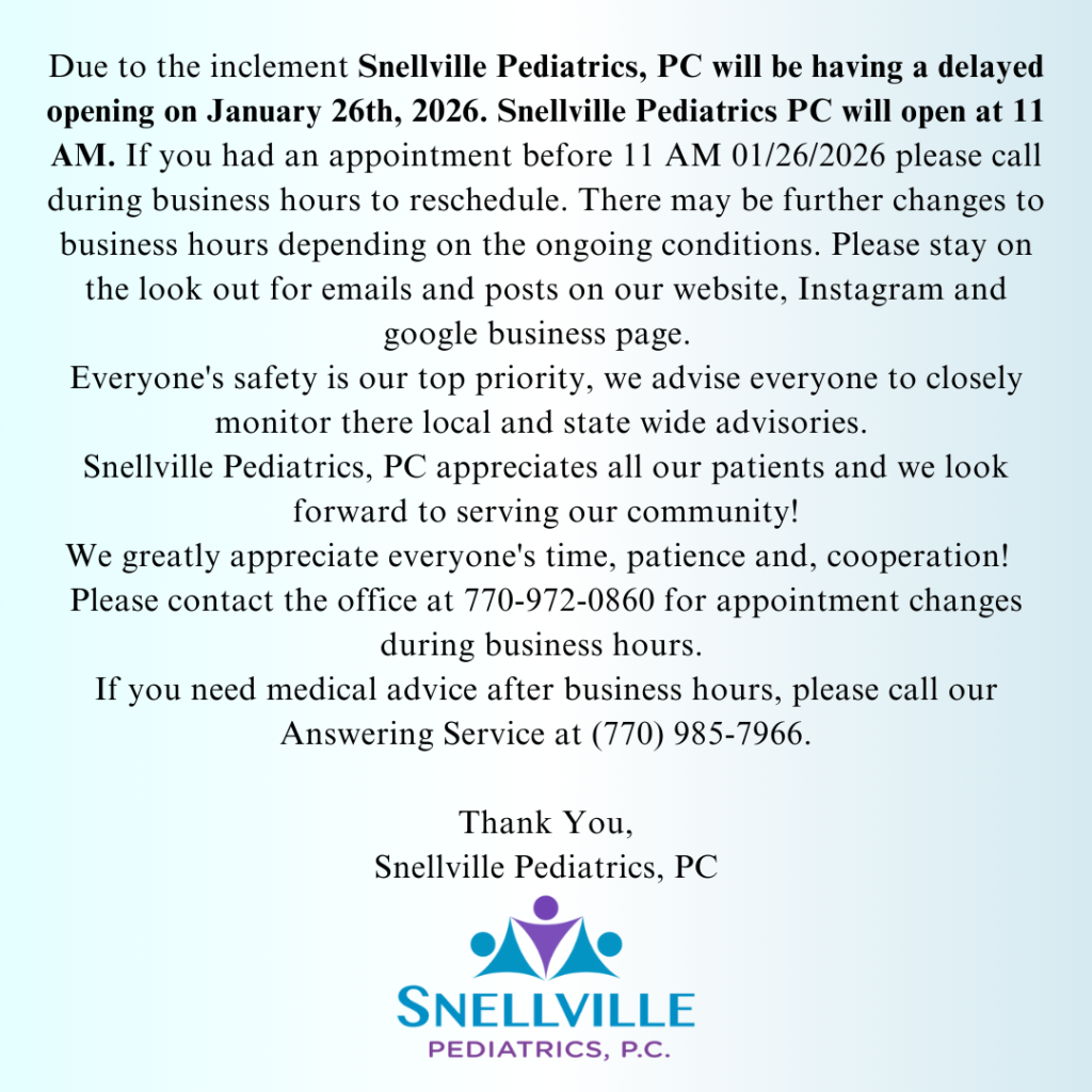 Snellville Pediatrics P.C. will close Monday, December 26th, 2022 in observance of Christmas Holiday. If you need medical advice, please call our Answering Service at (770) 985-7966.